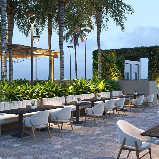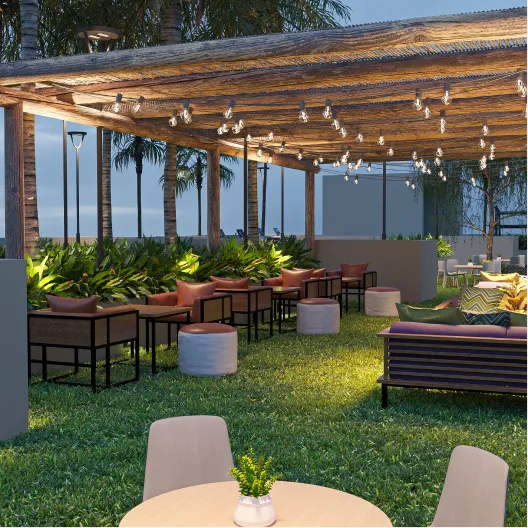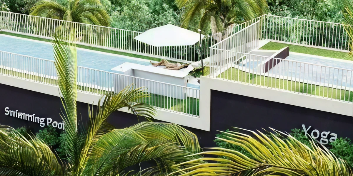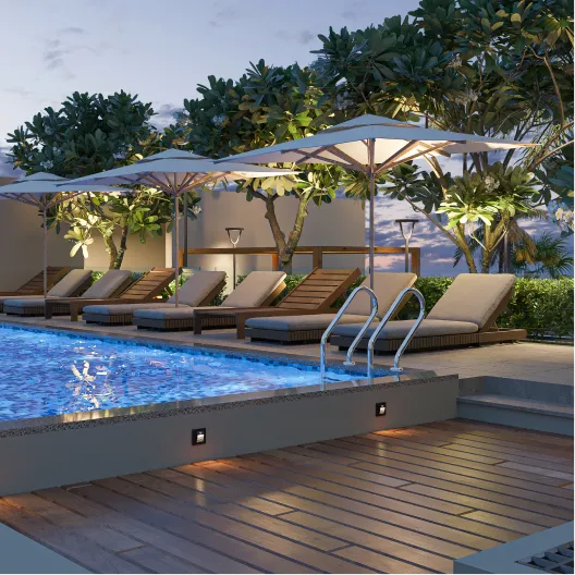 Rooftop pools, lounges, gym, social club, and wellness zones.